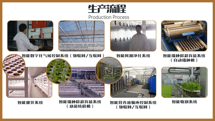 蔬菜工厂使用数字化的风淋净化系统、催芽系统、播种移栽育苗系统、营养液循环控制系统(物联网)、收割系统。水肥监测传感器实时采集水培池元素数据(营养液PH值和EC值)传输到计算机,计算机控制系统精准添加营养液。水培池营养液与污水自动处理后重新循环利用,节省资源又减少污染排放。