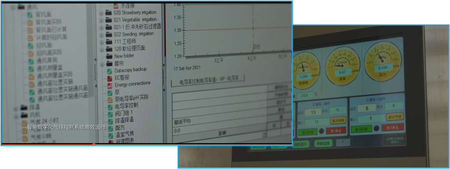蔬菜工厂及空中草莓园均为智能温室,采用数字化气候控制系统(物联网),棚内空气温湿度、大气压力、光照度综合、水位、风向风力、二氧化碳浓度及虫情传感器和大棚外部风向风力传感器和雨量采集器、监控数据采集器收集数据并传输至计算机进行数据分析并作出相应调整,打破季节限制,为蔬果提供最适宜的生长环境。反渗透过滤装置净化水,可去除水中的胶体、有机物、细菌、病毒等。